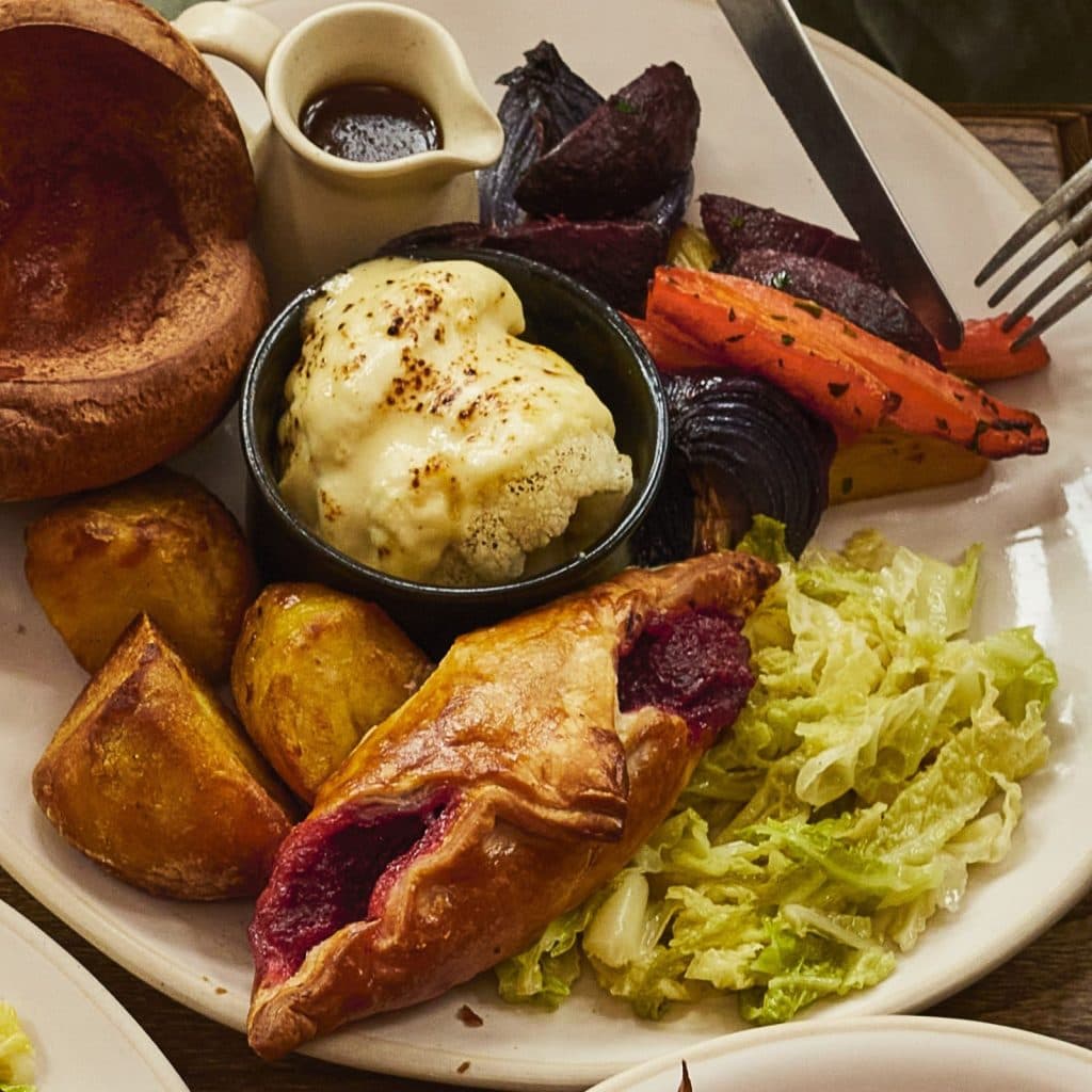 Every vegetarian roast also comes with cauliflower cheese, seasonal roast vegetables, Savoy cabbage, and of course bottomless roast potatoes, Yorkshire puddings and rich gravy, so nobody misses out on the trimmings that make a Sunday meal special.